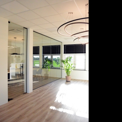 Kenmerkend voor de open ruimte is het frisse lijnenspel en de nadruk op transparantie via grote glaspartijen. Door de kasten subtiel in de wanden te verwerken werd extra werkruimte gecreëerd. Interior by Cornelis zorgde voor de volledige totaalinrichting.